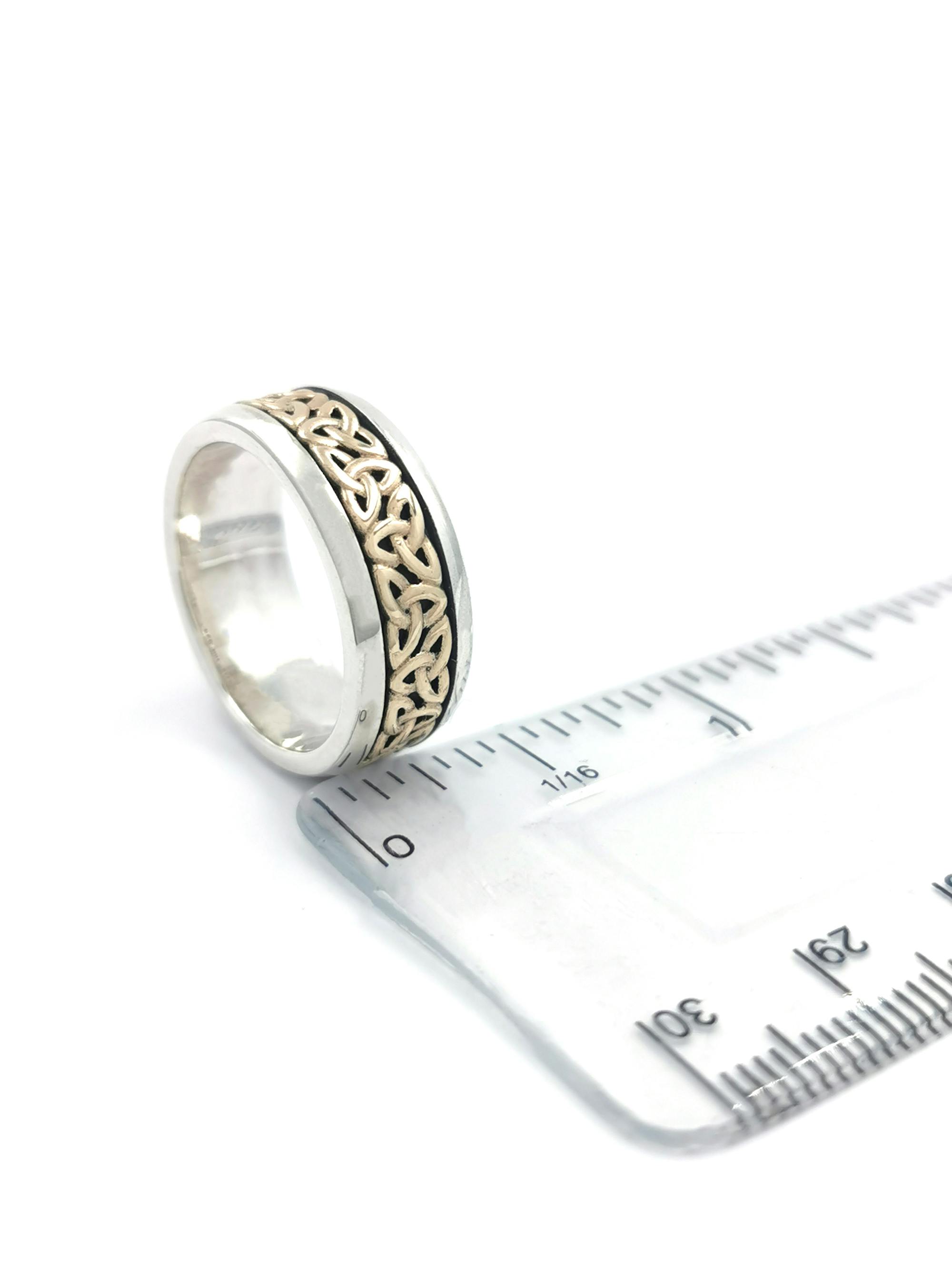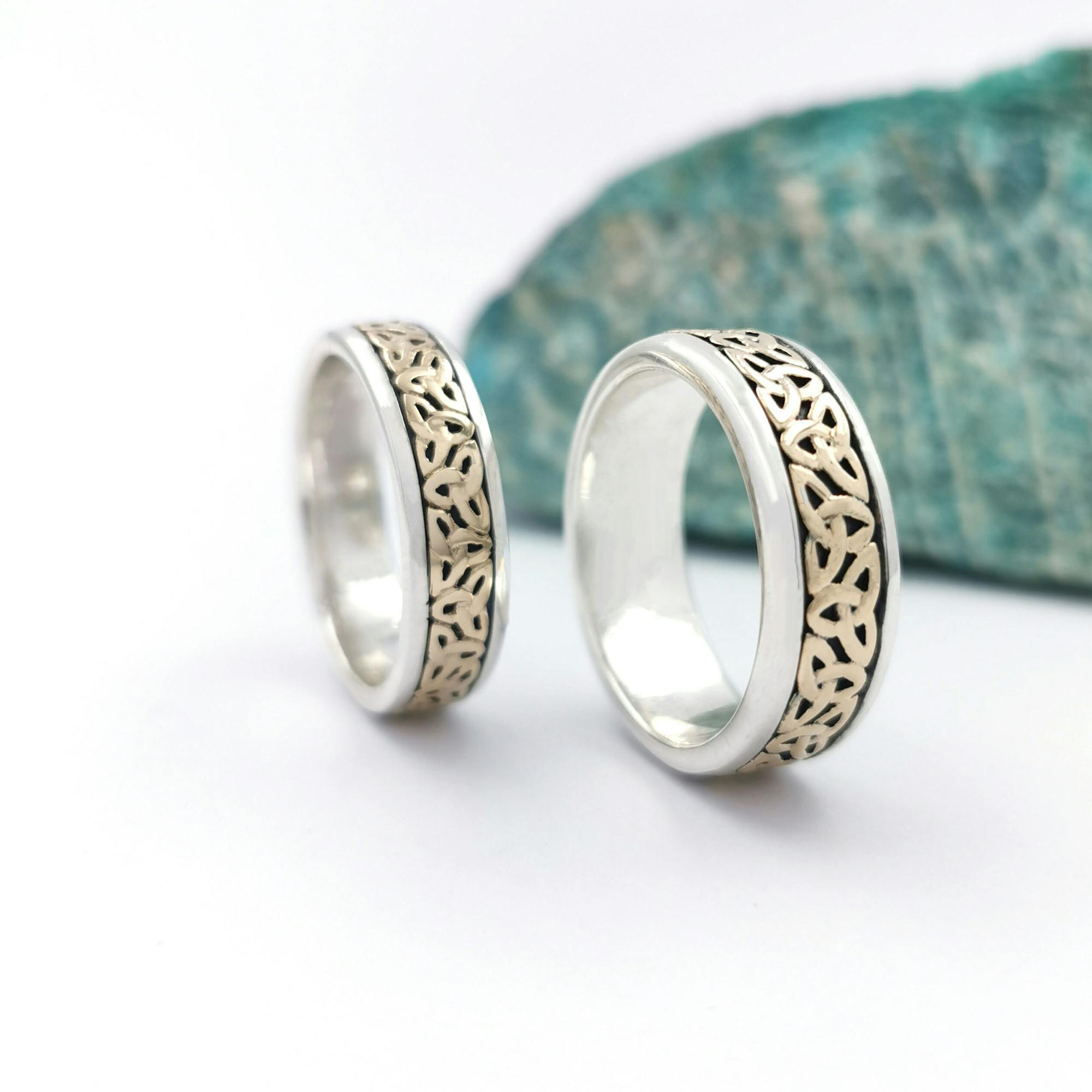 These elegant rings, crafted in 10K yellow gold and sterling silver, showcase eternal trinity knots that stand out magnificently against a dark, antique-style finish.
